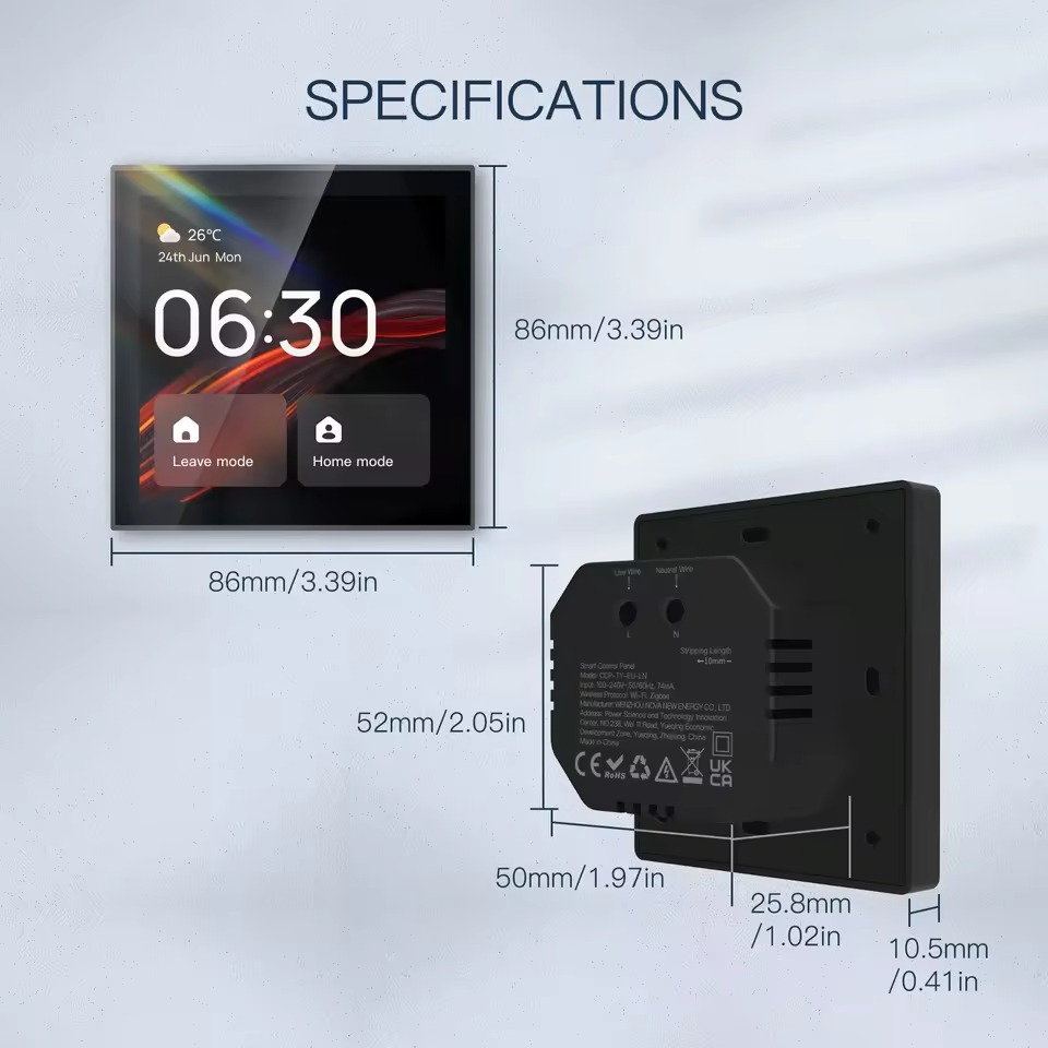 - Power Monitoring: **"The panel tracks the power consumption of connected loads and generates daily, weekly, or monthly reports. Users can analyze this data to create energy-saving plans and automations, optimizing energy use for sustainability. Monitoring appliance energy patterns makes it easy to reduce waste while maintaining comfort and functionality. *Note: A neutral wire is required. The panel is compatible with EU-type (round) and 86mm wall boxes and supports 1- and 2-gang round wall boxes.